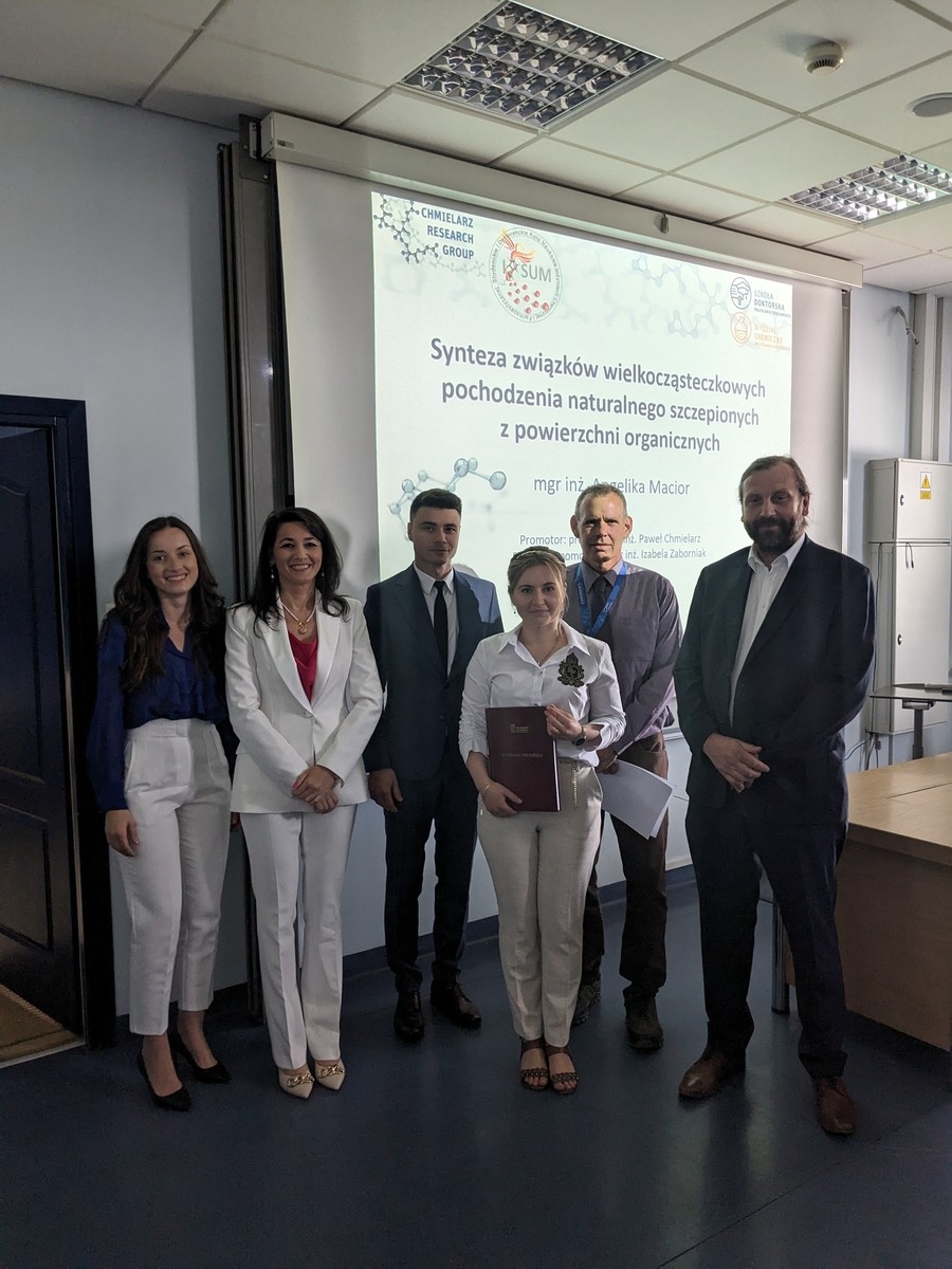 W dniu 22 maja br. mgr inż. Angelika Macior – członkini grupy badawczej Chmielarz Research Group (CRG) oraz Studenckiego i doktoranckiego Koła Naukowego Inżynierii Chemicznej i Farmaceutycznej IPSUM, obroniła pracę doktorską pt.: „Synteza związków wielkocząsteczkowych pochodzenia naturalnego szczepionych z powierzchni organicznych”, realizując prace badawcze na wydziale Chemicznym Politechniki Rzeszowskiej w Katedrze Chemii Fizycznej.