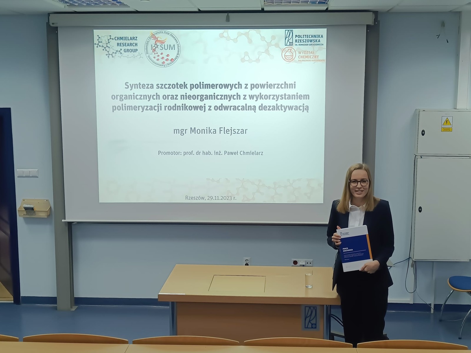 W dniu 29 listopada br. mgr Monika Flejszar z Katedry Chemii Fizycznej i członkini grupy badawczej Chmielarz Research Group obroniła pracę doktorską pt: „Synteza szczotek polimerowych z powierzchni organicznych oraz nieorganicznych z wykorzystaniem polimeryzacji rodnikowej z odwracalną dezaktywacją”.