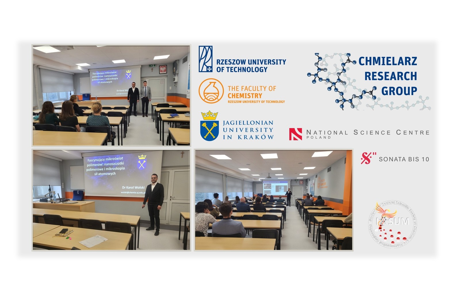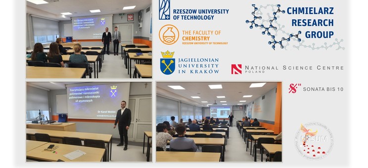 W dniach 11-23 lutego 2024 r. w Katedrze Chemii Fizycznej na Wydziale Chemicznym Politechniki Rzeszowskiej gościliśmy współpracownika naukowego z Uniwersytetu Jagiellońskiego - dr Karola Wolskiego, uznanego eksperta specjalizującego się w syntezie i charakterystyce przewodzących nanoszczotek polimerowych o zaawansowanej architekturze. W ramach swojego pobytu, dnia 15 lutego 2024 r. dr Wolski wygłosił do członków Chmielarz Research Group oraz Studenckiego i Doktoranckiego Koła Naukowego Inżynierii Chemicznej i Farmaceutycznej IPSUM, a także społeczności studentów i pracowników Wydziału Chemicznego interesujący wykład o tematyce związanej z nanoszczotkami polimerowymi i mikroskopią sił atomowych.