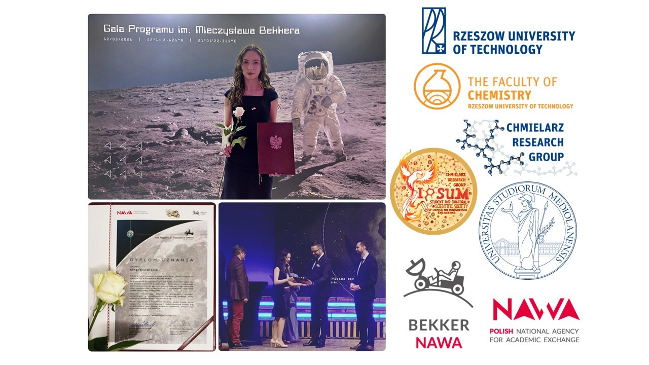 Z przyjemnością informujemy, że w gronie tegorocznych stypendystów znalazła się mgr inż. Kinga Siewierska z grupy badawczej prof. dr hab. inż. Pawła Chmielarza (Chmielarz Research Group). Dzięki stypendium Bekker NAWA zrealizuje ona zagraniczny pobyt badawczy w grupie prof. Elisabetty Ranucci na Uniwersytecie w Mediolanie (Università degli Studi di Milano), realizując projekt badawczy pt. „Synteza biokompatybilnych środków sieciujących do utwardzania materiałów na bazie polidimetylosiloksanu (PDMS) do zastosowań okulistycznych” mający na celu opracowanie nowych biomateriałów do zastosowań w okulistyce.