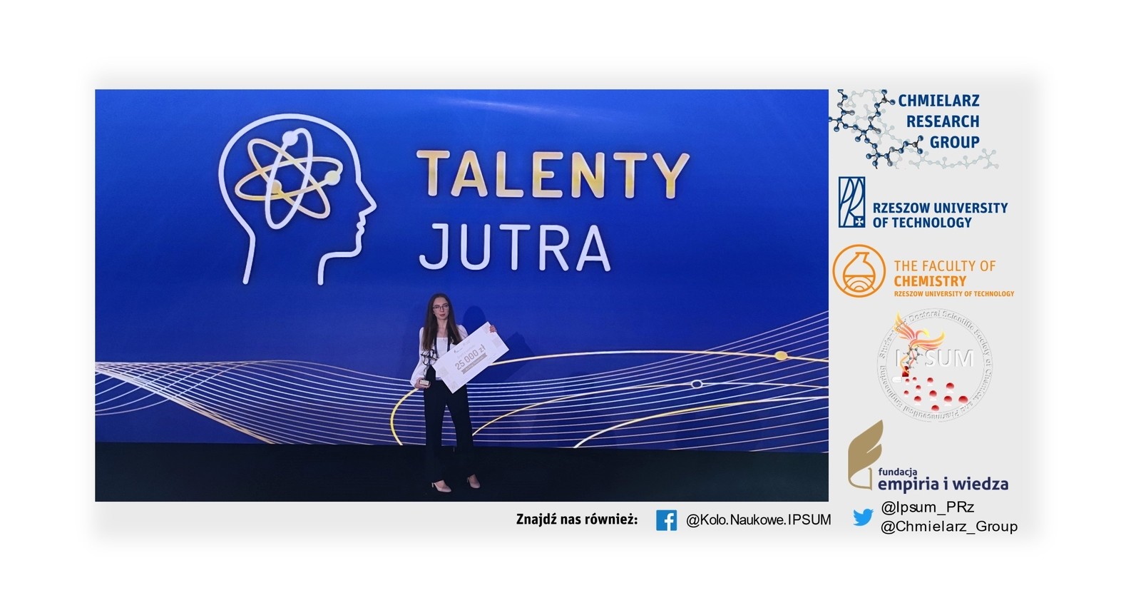 Wśród zwycięzców znalazła się także Kinga Ślusarczyk, członkini grupy badawczej Chmielarz Research Group (https://pchmielarz.v.prz.edu.pl/en/group-members), pełniąca funkcję wicesekretarza Studenckiego i Doktoranckiego Koła Inżynierii Chemicznej i Farmaceutycznej „IPSUM” (https://ipsum.prz.edu.pl/). Swój projekt pt. ,, Nanokompozyty polimerowe o złożonej strukturze jako rusztowania do wzrostu kości oraz nośniki w miejscowym dostarczaniu leków” będzie realizować pod opieką prof. dr hab. inż. Pawła Chmielarza, Kierownika Katedry Chemii Fizycznej.